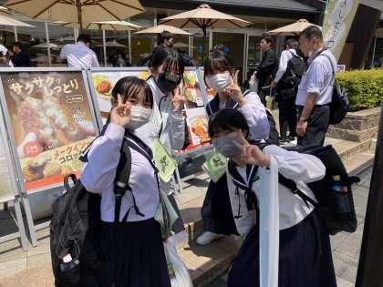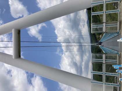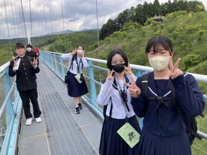 学級分散で、まずA組は三島スカイウォークを見学しました。日本一の大吊り橋で、全長400m、高さ70mです。