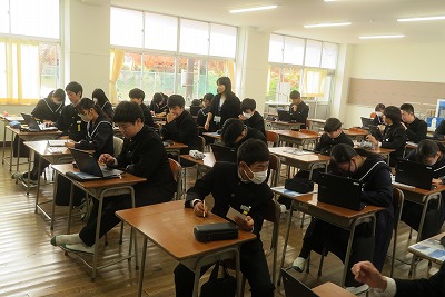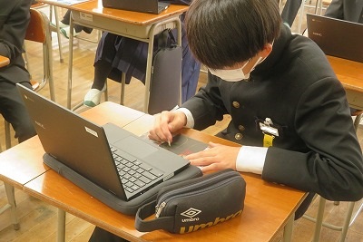 3年生の美術の授業では、「装飾について考えよう」という学習課題で、作品の制作に取り組みました。黒い表面をひっかくことで、カラフルな模様を浮き出すようにして、自分の好きなデザインを絵にしていました。デザインを決める参考に、タブレットも活用しています。