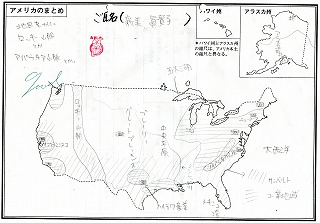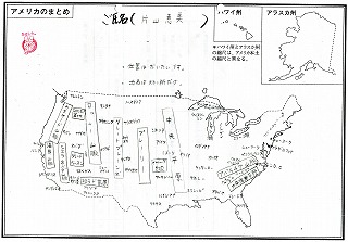 アメリカについて学んでいます 公開日 2011/11/11 更新日 2011/11/11 1年生より 1年生の社会では“アメリカ合衆国”に関する授業が行われています。広大なアメリカ合衆国は近いようで遠い国であり,情報も多数あり,たくさん知りたいこと・興味深いところがあります。そしてぜひ行ってみたいという声も聞こえてきます。 そんなアメリカの地図を作成してみました。みなさん一生懸命に調べ学習をしてきていました。とても立派でした。 いいね(0)