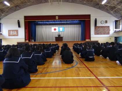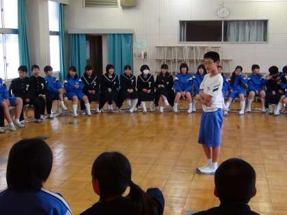 本日は朝会が行われました。テニス部の3年生の先輩が,東海ジュニアスポーツフェスティバルで入賞し,校長先生から表彰されたのを見て,大きな拍手をおくりました。次こそは自分たちの番だという強い意気込みをもったことと思います。