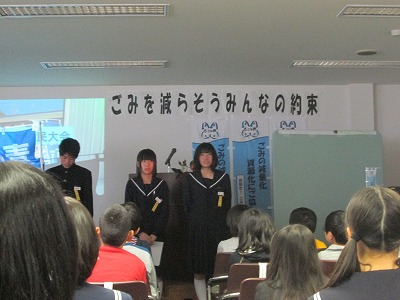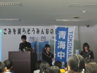 青海中から生徒会の代表が3名が青海中の取り組みについて報告しました。