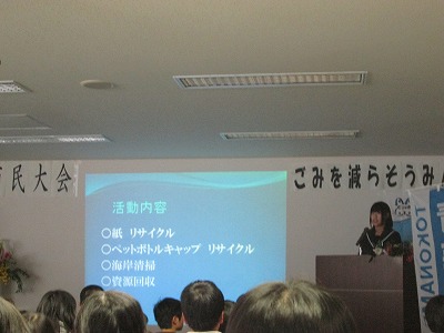 各教室での紙やペットボトルキャップのリサイクル活動、資源回収、海岸清掃について紹介しました。