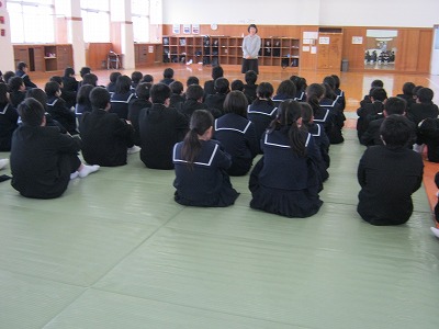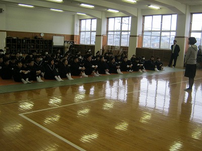 何度も行ってきた学年集会も、今回で最後となりました。1年間休まずに登校した生徒は31名。学年の先生たちで作成した、皆勤賞の表彰状を手渡しました。その後、5人の先生方から話をしていただきました。どの生徒もいつも以上に真剣に聞く姿が印象的でした。