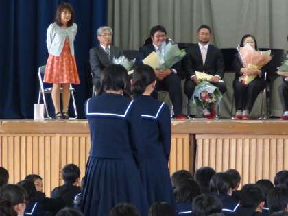 本日の3年生(4月18日) 公開日 2014/04/21 更新日 2014/04/21 3年生より 離任式が行われました。昨年度,大変お世話になった先生方がご来校され,最後のご指導をいただきました。 先生方からありがたいお言葉をいただきました。恩をお返しする気持ちでこれからの生活を頑張っていきましょう。 また,3年生や部活動のみんなから先生方へエールをお送りしました。みんなの思いを先生方も受け止められて新たな地で頑張ってくださるでしょう。 いいね(0)