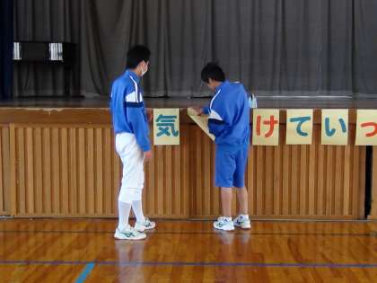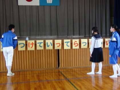 本日から1年生は宿泊体験に出かけます。本日は,生徒会役員が1年生に激励のメッセージを送りました。元気に出かけて欲しいという意味を込めて,「いってらっしゃい」という表示をを張りました。