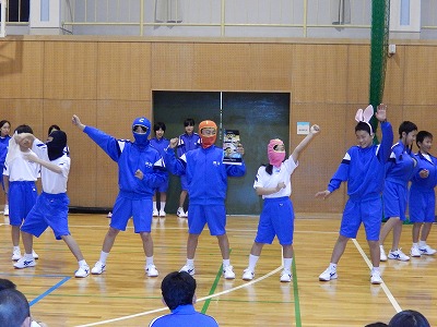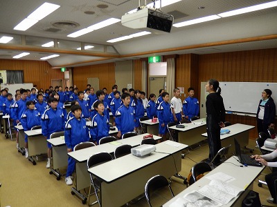 入所式を終えたあと昼食をとり、学年研修を行いました。そこでは青海中学校の校歌を練習したり、青海中学校のきまりや学習の仕方などの話を聞きました。次に第1回渡辺オリンピックを行いました。各クラスが団結して競技に取組ながら、友達との交流を深めることができました。夜は三役による劇や合唱コンクールなどが行われ、楽しく時間を過ごすことができました。
