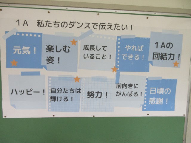 1年生の廊下には、体育祭のダンス発表にどんな思いをこめるかということをまとめて掲示してあります。「元気な姿」「成長した姿」「団結の姿」「楽しむ姿」など純粋な思いがあふれています。技術だけでなく、心がこめられた発表を目指しています。