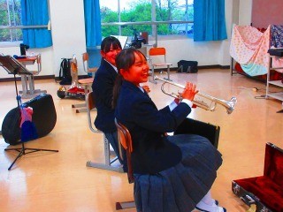 興味のある部活を選んで体験をします。今日は、雨天のため、屋内の部活動のみでしたが、先輩と一緒にトレーニングをしたり、楽器の音の出し方をマンツーマンで教えてもらったり、思い思いのイラストを描いたりと、楽しそうに体験していました。