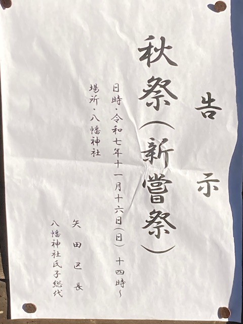 11月16日(日)に、さわやかな秋晴れの下、矢田区の秋祭(新嘗(にいなめ)祭)が行われました。小学生の見事な巫女舞もありました。五穀豊穣に感謝する伝統ある祭礼です。地域の皆様が伝統を大切にされ、自然の恵みに感謝されているお姿に敬意を表します。