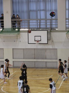 郡大会のバスケットボール部女子の試合が、東海市体育館で行われました。大府北中と対戦し、18点ほどの差で負けていましたが、追い上げ、2点差まで詰め寄りました。最後の数秒で3ポイントシュートを狙ったシュートが放たれた時は、固唾(たかず)を飲んで、皆が見守りました。結果はゴールになりませんでしたが、もし決まっていたら、最後の5秒ほどで大逆転でした。本当によくがんばりました。感動をありがとう。卒業生の先輩も応援に来てくれました。これまで熱心に御指導くださったTコーチ、本当にありがとうございました。保護者の皆様も応援ありがとうございました。