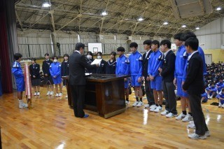 12月最初の朝会では、市内大会団体優勝のソフトテニス男女や半田市新人大会で優勝のバスケットボール女子、県大会ダブルス3位のバドミントン大会の表彰がありました。たくさんの生徒が表彰されました。素晴らしいです。