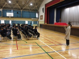 朝会では、本校の学校運営協議会会長の権田様をお招きして、全校生徒に講話をしていただきました。ご自身も青海中の卒業生でいらっしゃり、大先輩として在校生に心のこもったメッセージをお話くださいました。防災の対応のこと、自助、共助のことなどを分かりやすくお話をしてくださいました。最後は、やなせたかしさんの詩を紹介してくださいました。いつもありがとうございます。