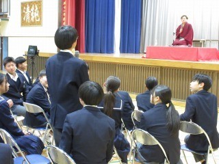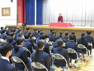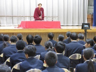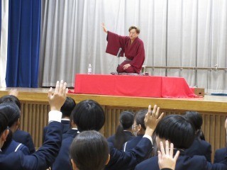 1・2年生合同で、初の「英語落語公演会」を行いました。愛知県内を中心に活躍される落語家の喜餅(きもち)さんをお招きし、英語落語を聴いたり、将来のキャリア形成に関するお話をお聴きしたりしました。将来の生き方を考える上でも参考になったと思います。公演後の質疑応答では、「英語のよりよい勉強の仕方」や「英語を学習して今の仕事でどんなことに役に立っているか」などの質問が出ました。