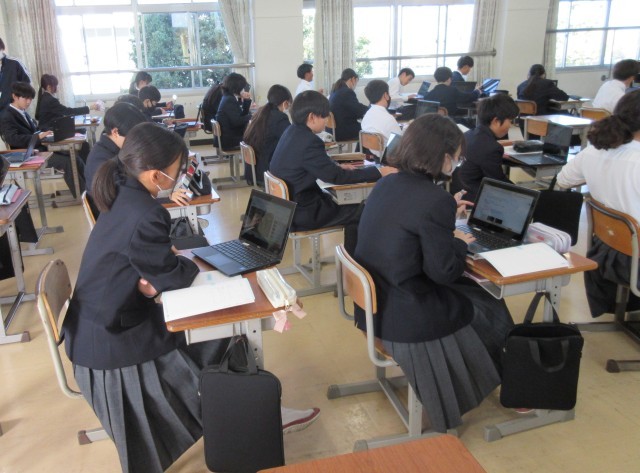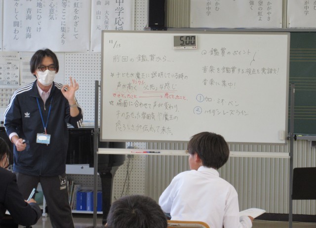 1年生の音楽の授業では、「魔王」の鑑賞を行いました。鑑賞のポイントを事前に確認したことで、各自集中して活動を行っていました。1人1人タブレットで、魔王を聴きながら、気付いたことをまとめていきました。発言者の顔を見て話を聞く意識があり、温かい雰囲気になりました。