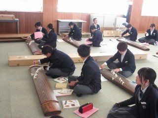 1年生では、音楽の時間に箏の演奏の仕方を学びました。日本の伝統音楽に触れるよい機会になりました。「さくらさくら」を少し弾けるようになりました。箏の台数が限られているため、交代で練習しました。