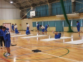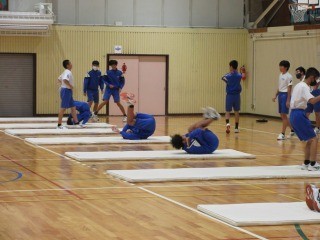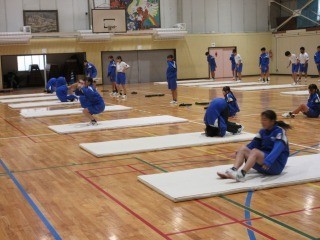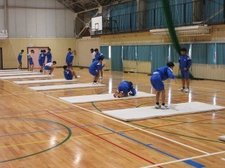 2年生の保健体育の授業の様子です。マット運動の学習に入りました。安全面も確認して、単元の流れを確認しています。前転、後転等の基本的な動きも確認し、次のステップにつなげています。集中して取り組んでいます。