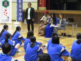 技能五輪あいち2028のための、「One School One Country」の事業が青海中で行われました。愛知県の代表としては、市内の中学校では、青海中がこの事業に取り組みました。モロッコとナイジェリアの留学生の方を迎え、交流をしました。2028年には、市内の全小中学校も交流先の国を決めて、交流する案もあるそうです。2年生の生徒が、持ち味を生かして、交流を楽しみました。