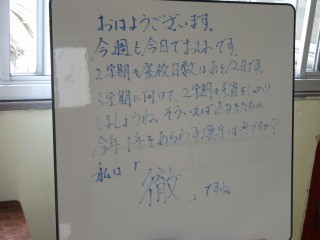 2年生の廊下には、職場体験の記録の掲示物や、英語の授業で取り組んだマレーシアの子どもたちとの交流の掲示物が掲示されています。そして、階段あたりには毎朝、学年主任のメッセージが書かれたホワイトボードが書かれています。今日は、今年を象徴する漢字一文字は何ですか?と問いかけるメッセージもありました。子どもたちのことを考えた温かいメッセージが書かれています。