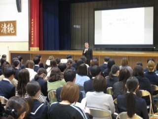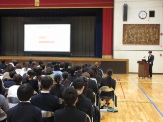 親子で説明等をお聴きいただきました。最初は、デンソー人事部の神谷様より「就職や進学において求められる人材について」というテーマで、ご講演をいただきました。これから受験に臨む心構えや将来社会に出るために必要な力などについて理解を深めることができました。しゃけのおにぎりを例にしたお話など大変分かりやすいお話でした。