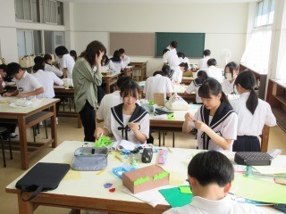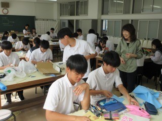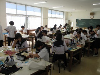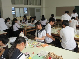 3年生の家庭科の授業では、保育園・幼稚園の園児が楽しめるおもちゃづくりを行っています。幼い頃を思い出しながら、楽しそうにおもちゃや飾りなどを作っています。アイデアに富んだ作品がいっぱいです。