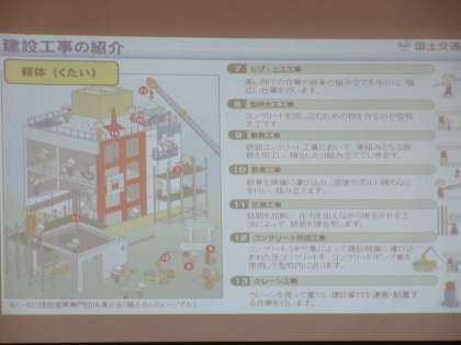 一人目の講師の先生は、松 居 孝 道 氏(国土交通省中部整備局建政部建設産業調査官)です。東日本大震災で建設業者が行った行動;建設という仕事についてお話しくださいました。土木と建築があって、一つの建造物を作るのに、壮大な数の職種と人数がかかわること。そしてその力を東日本大震災の時にはいろんな場面んで発揮したことなどをお話しくださいました。手がけたものが地図に載る。すばらしい仕事ですね。