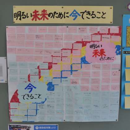 「明るい未来」が桃色で「今できること」が水色で貼ってあります。