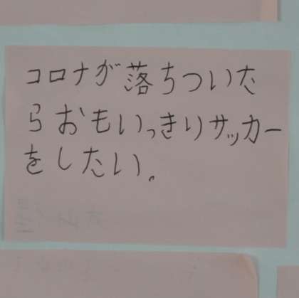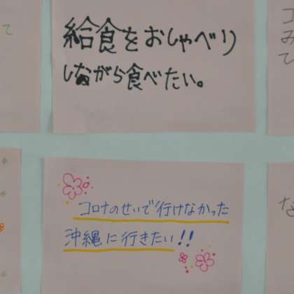 桃色には「おもいっきりサッカーをしたい」「給食をおしゃべりしながら食べたい」「行けなかった沖縄に行きたい」などなど……生徒の願いが心に響きます。