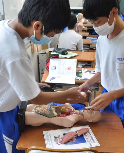 小型の人体模型を使い、バラバラにした内臓等を正しい位置にはめ直しています。