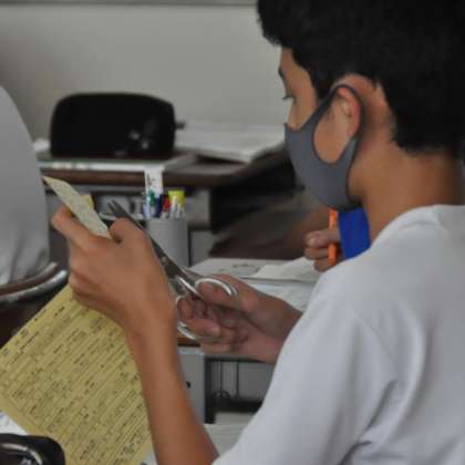 I先生から配られた授業計画の黄色い用紙を切って、ノートに貼っています。