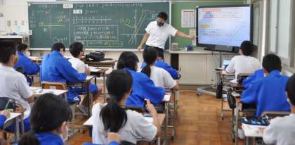 生徒たちは電子黒板を見ながら、グラフのかき方について積極的に学んでいます。