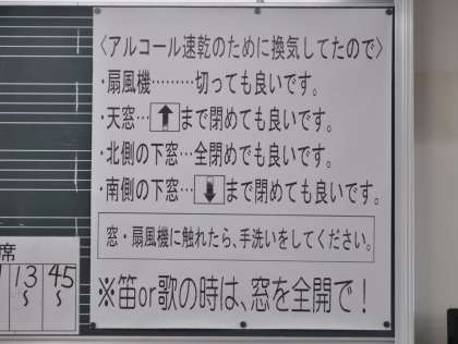 また、黒板にはI先生作の掲示物が貼られており、感染予防対策に関わる指示がよく分かります。