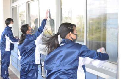 寒風に耐えながら、窓ガラス(外側)を拭く生徒たちがいます。