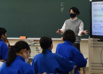黒板に「公平」と書かれており、一見すると「道徳」の授業のようですが、「効率と公正」という社会科の学習です。