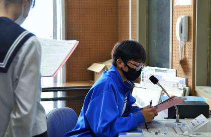 (下)出番を待つ委員長たちです。“応接室”に入っています。緊張感が伝わってきますが、約1名、とても余裕がありそうな……。