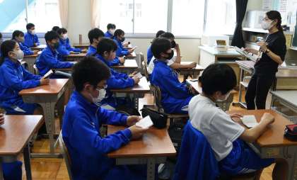 各教室で生徒手帳を見ながら対応の確認をしたり、校区内の危険箇所の確認をしたりしています。(画像上から1A・2D・3D)