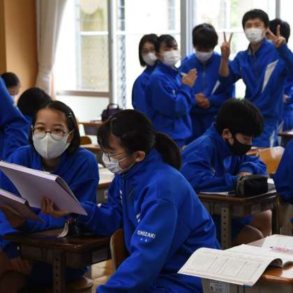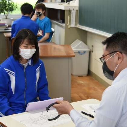 M先生とクリス先生を相手に「スピーキング・テスト」を実施しています。