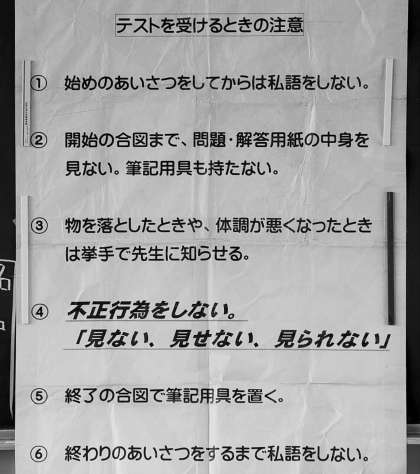 どのクラスも黒板に「テストを受けるときの注意」が貼られています。