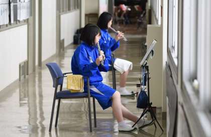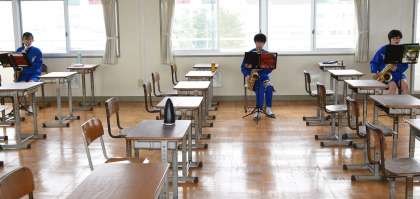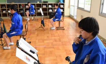 「緊急事態宣言」のため音楽の授業では器楽演奏ができませんが、部活動では画像のように少人数ずつで距離をとることができるため、パートごとの練習が可能です。