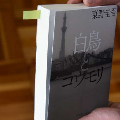 今日は1冊の本を紹介します。中学生のみなさんは誰も知らないのではないかと思いながら話します。題名は「白鳥とコウモリ」で、作者はミステリー作家の東野圭吾さんです。この4月に出たばかりの新しい本です。「白鳥とコウモリ」という題名ですが、鳥の本ではなく推理小説です。
