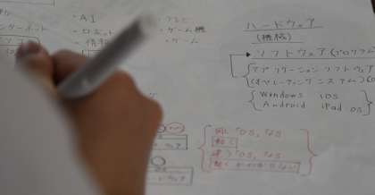 コンピュータに関する学習で、黒板には「ハードウェア」「アプリケーションソフトウェア」「オペレーティングシステム」などの言葉が書かれています。