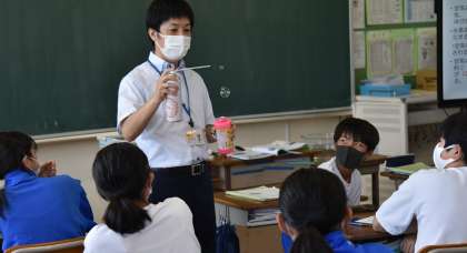 「水素」や「二酸化炭素」等を使ってシャボン玉を作り、動きの違いを見ています。