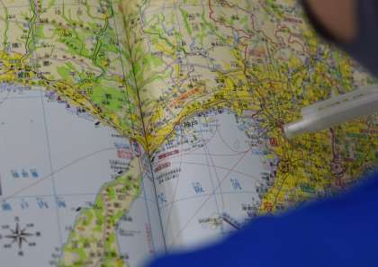K先生から、阪神大震災の震源地を見つけるように言われ、地図帳を使って探しています。