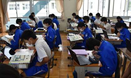タブレット端末に向かって、個別に課題に臨んでいます。