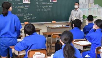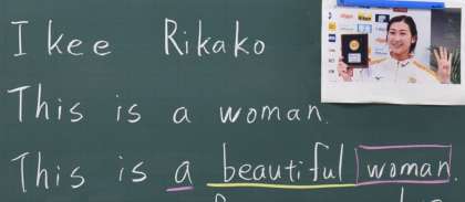 例文の学習では、池江璃花子選手や大谷翔平選手の写真が黒板に貼られました。