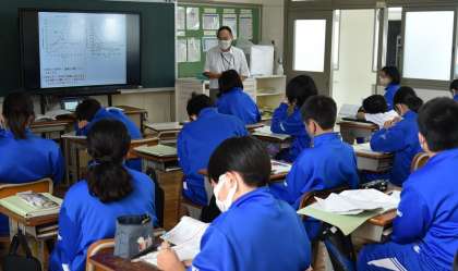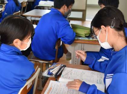 先生の説明を聞いたあと、近くの生徒同士で相談をしながら学習を進めています。
