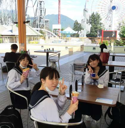隣のテーブルではE組の3名が、あま〜いお昼ごはんを食べています。