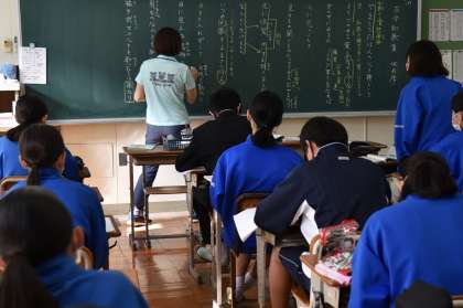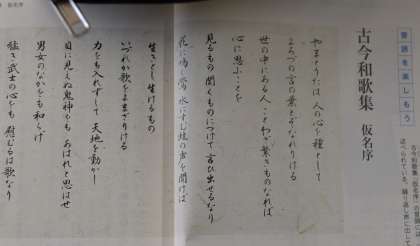 和歌の学習に入る前に、黒板に書かれた「仮名序」という冒頭の部分について読み取っています。