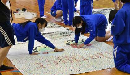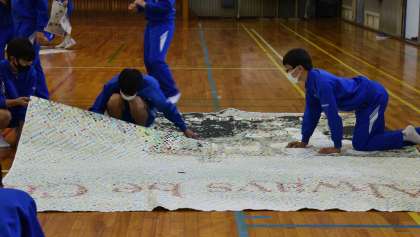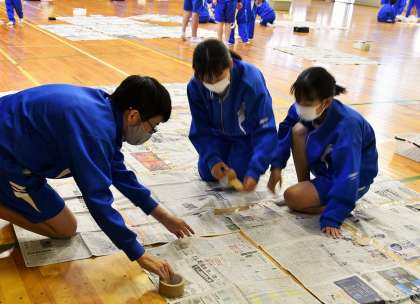 体育館では「モザイク壁画」のために新聞紙を貼り合わせたり、台紙を貼り付けたりしています。