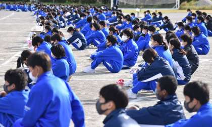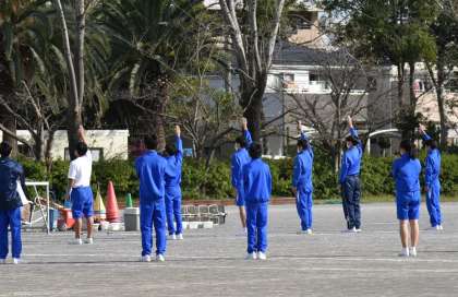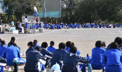 控え席で、選手としてはもちろん、それぞれの役割についても頑張るようにという生徒会長の話を聞いています。