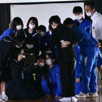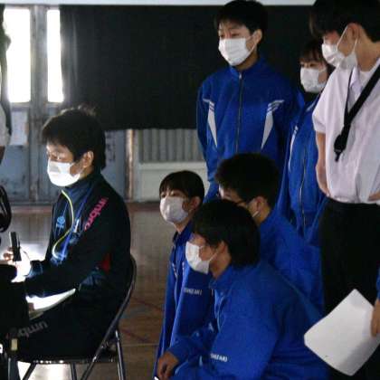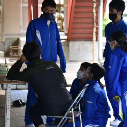 体育館のスタッフの生徒たちも、タブレット端末を使って映像を視聴しています。